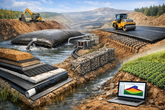 В докладе рассматриваются современные геосинтетические материалы, применяемые при строительстве транспортной и промышленной инфраструктуры, а также в горнодобывающей отрасли. Предметом анализа являются тканые полиэфирные и полипропиленовые полотна, георешётки, противоэрозионные маты, композитные гидроизоляционные мембраны и геотубы. Научная проблема связана с обеспечением долговременной прочности, устойчивости и фильтрационной эффективности конструкций в сложных инженерно-геологических условиях, включая болотистые территории, слабые основания и техногенные водоёмы. Для обоснования проектных решений использованы расчёты в программных комплексах PLAXIS и GEO5 с оценкой коэффициента устойчивости, перераспределения напряжений и сцепления слоёв асфальтобетона. Представлены результаты применения армирующих обойм, георешёток и композитных материалов при строительстве насыпей, подпорных стен и гидротехнических сооружений, а также технологии обезвоживания шламов в геотубах. Показано, что использование полимерных геосинтетиков обеспечивает повышение надёжности сооружений и оптимизацию материалоёмкости при сохранении нормативных параметров долговечности.