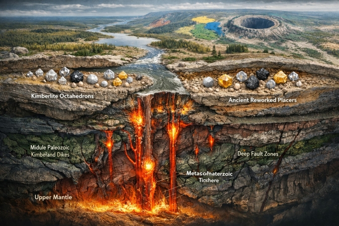 В аннотации рассматривается пересмотр традиционной модели алмазоносности Сибирской платформы. Показано, что классическая кимберлитовая парадигма не объясняет происхождение богатейших россыпей северо-востока платформы, для которых не выявлены адекватные коренные источники.