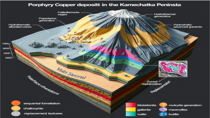 Медно-порфировое месторождение Кумроч на восточной Камчатке исследовано с целью уточнения последовательности рудообразования и морфоструктурных типов рудных тел. Работа основывается на анализе 246 аншлифов, с применением оптической и сканирующей электронной микроскопии.