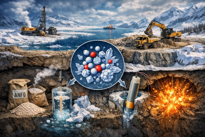 Представлены результаты разработки морозоустойчивого эмульсионного взрывчатого вещества, предназначенного для применения при освоении месторождений твёрдых полезных ископаемых в районах Полярного Урала, Восточной Сибири и Дальнего Востока. Научная проблема связана с обеспечением стабильности эмульсионных систем при циклах замораживания и оттаивания в диапазоне арктических температур, а также с ограничениями использования простейших аммиачно-селитрных составов в условиях водонасыщенных и сезонно оттаивающих пород. В основу решения положен физико-химический анализ фазовых превращений окислительной эмульсии и целенаправленное регулирование водосодержания с учётом образования кристаллогидратов нитрата кальция и хлорида кальция. Разработана рецептура бинарной окислительной фазы с минимизацией свободной воды, обеспечивающая структурную устойчивость обратной эмульсии. Полученные составы характеризуются стабильностью в широком температурном интервале, упругопластическими свойствами и надёжной детонацией от капсюля-детонатора, что расширяет возможности безопасного и экономически целесообразного ведения взрывных работ в арктических регионах.